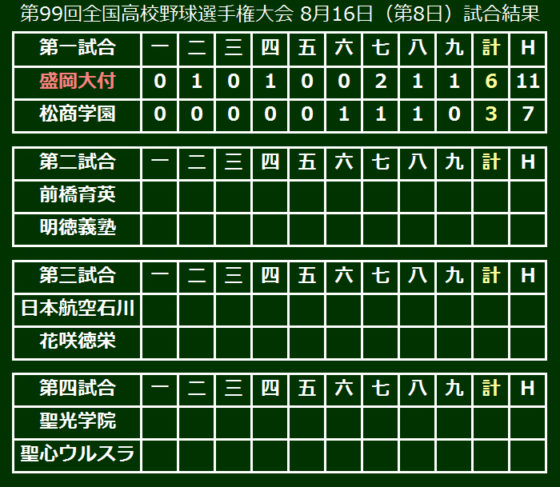 第99回全国高等学校野球選手権大会は14日、大会第8日が行われ、第1試合は1回戦で昨夏王者の作新学院(栃木)を破った盛岡大付(岩手)が松商学園(長野)を6-3で破り、3回戦に進出した。