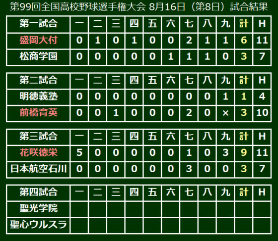 第99回全国高等学校野球選手権大会は14日、大会第8日が行われ、第3試合は花咲徳栄(埼玉)が日本航空石川(石川)を9-3で破り、3回戦進出を決めた。初回に一挙5得点。終盤7回には2年生4番の野村の一発などで追加点をもぎ取り、逃げ切った。