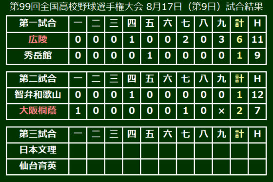 第99回全国高等学校野球選手権大会は17日、大会第9日が行われ、第2試合は大阪桐蔭(大阪)が智弁和歌山(和歌山)を接戦の末に2-1で下し、史上初2度目の春夏連覇に向けて16強入りを果たした。