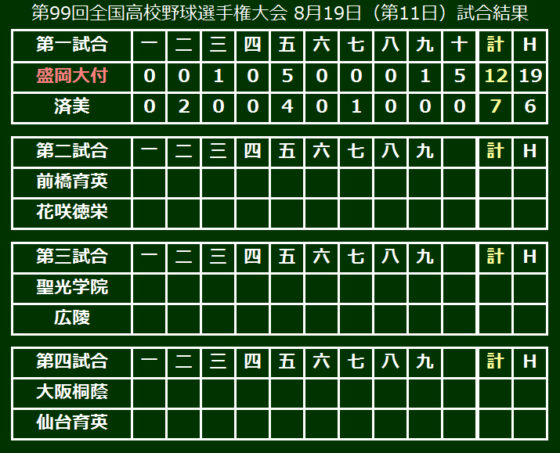 第99回全国高等学校野球選手権大会は19日、大会第11日が行われ、第1試合で盛岡大付(岩手)が済美(愛媛)を12-7で下してベスト8進出を果たした。両校とも満塁本塁打が飛び出すなど点の取り合いとなった試合は延長10回に盛岡大付の5得点で決着した。