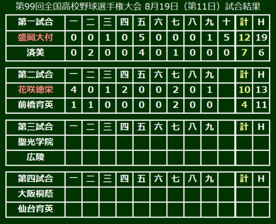 第99回全国高等学校野球選手権大会は19日、大会第11日が行われ、第2試合で花咲徳栄(埼玉)が前橋育英(群馬)を10-4で下してベスト8進出を果たした。初回に4点を奪うとその後も攻撃の手を緩めず、13安打で10点を奪い、快勝した。