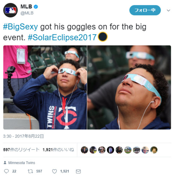 アメリカでは21日(日本時間22日)、1918年以来99年ぶりとなる皆既日食が観測され、全米で大きな盛り上がりを見せた。西海岸から東海岸まで北米大陸を横断する形で観測された世紀の天体ショーに、メジャー選手たちも夢中になったようだ。