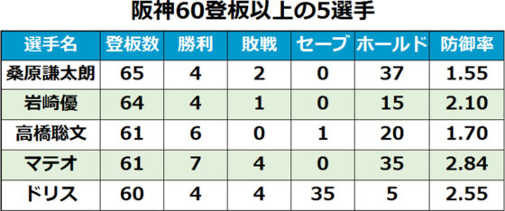 阪神は9月27日のDeNA戦で延長12回にドリスが登板し、1回を無失点に抑えた。これがドリスにとって今季60回目の登板で、NPB史上初めて5人の投手が60試合以上に登板した。