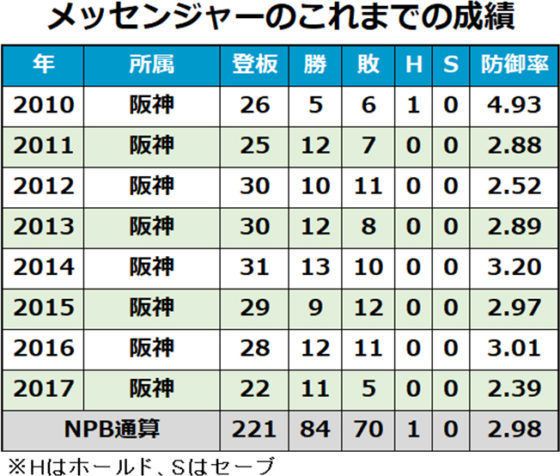 阪神は20日、ランディ・メッセンジャー投手と来季の選手契約を締結したことを発表した。2010年に阪神に加入した助っ人右腕は、通算221試合に登板し、84勝70敗、防御率2.98の成績。8年目の今季は負傷離脱もありながら、22試合登板で11勝5敗、防御率2.39をマークした。