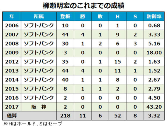 柳瀬は2005年大学生・社会人ドラフト6位で龍谷大からソフトバンクに入団。2013年に44試合登板で4勝0敗1セーブ11ホールド、防御率1.52をマークするなど活躍したが、16年限りで戦力外となった。今季は阪神と契約するも、2試合のみの登板に終わっていた。