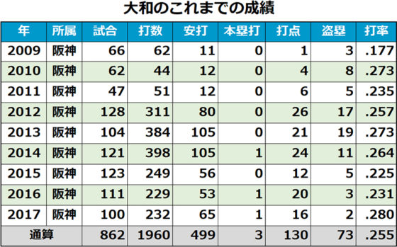 大和は阪神、オリックスとも交渉していたが、今季19年ぶりの日本シリーズに出場するなど躍進したDeNAを選択した。二遊間を中心に内外野をこなす“便利屋”で、今季からはスイッチヒッターに転向し、100試合で打率.280とポテンシャルの高さをみせていた。
