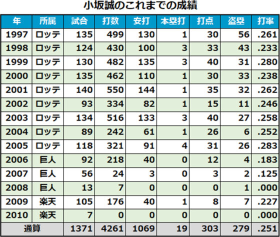 小坂氏は1996年のドラフト5位でロッテに入団。遊撃の名手として活躍し、2005年オフに金銭トレードで巨人に移籍した。その後、2008年オフには楽天へと移籍。2010年限りで現役を引退した。