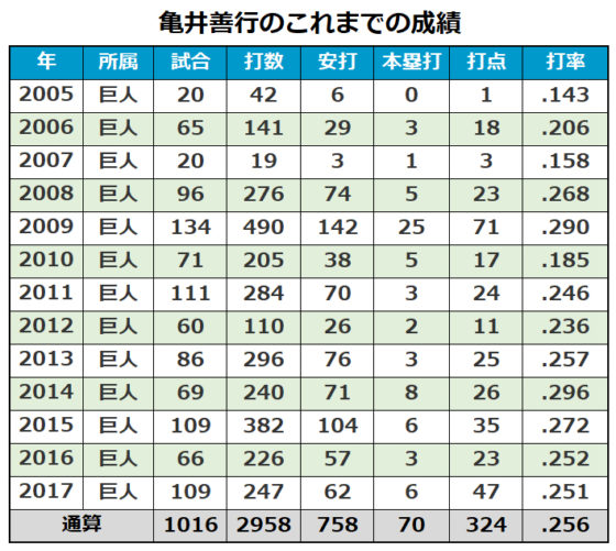 巨人では来季プロ14年目を迎えるベテラン亀井義行外野手が契約更改交渉に臨み、200万円アップの5200万円でサインした(金額は推定)。今季は109試合に出場し、打率.251、6本塁打、47打点、出塁率.325の成績だった。だが、代打打率は.342と勝負強さを発揮した。