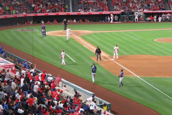 19時5分、試合開始。スコアを付けながら試合を追います。昨年DAZNでボクと同じタイミングでMLB解説者としてデビューされた作曲家の成瀬英樹さんがiPadにスコアを付けていたことに影響され、ボクもそのスタイルを今回から踏襲。周りの記者の方々に「それいいね!」と評判も上々でした。試合はプホルスやキンズラーにホームランが飛び出し、大谷選手も得点には絡まなかったものの二塁打を放ち、エンゼルスがレンジャーズに6-0と完封勝利。若干21歳のルーキー、ハイメ・バリアが6回無失点の好投で早くも5勝目(1敗)。ただ試合終了時にレンジャーズのオドーアがエンゼルス遊撃アンドレルトン・シモンズに足を向けてスライディングをしたことで一悶着あり、翌日以降に不穏な空気を残す結末となりました。レンジャーズの先発、そして現役最年長選手であるバートロ・コロンは3回6失点。拝めただけでも貴重ですが、残念な結果となりました。