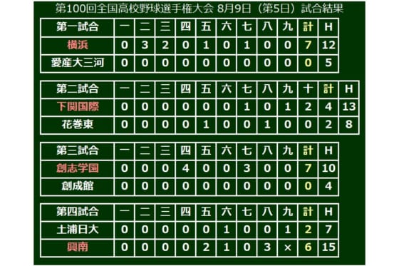 第100回全国高等学校野球選手権記念大会第5日、第4試合は興南(沖縄)が土浦日大(茨城)を6-2で破り2回戦に進出した。