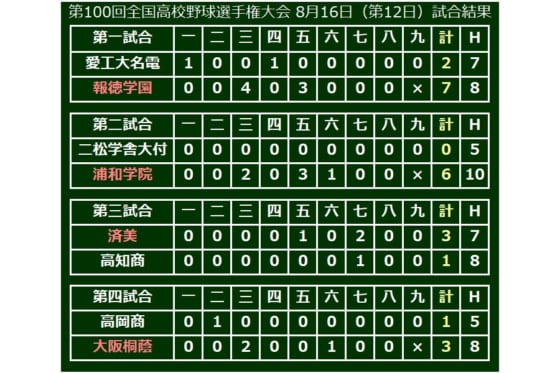第100回全国高等学校野球選手権記念大会は第12日は16日、3回戦4試合を行った。