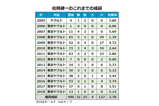また、松岡は2004年の自由獲得枠で九州東海大からヤクルトに入団。通算490試合登板で32勝25敗4セーブ127ホールド、防御率3.78の成績を残した。