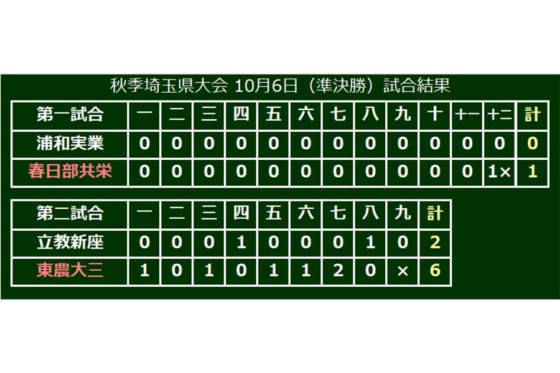 秋季埼玉県高校野球大会は6日、県営大宮球場で準決勝が行われ、ともにノーシードの東農大三が立教新座を6-2で下し、8日の決勝で初優勝を懸けて春日部共栄と対戦することになった。決勝進出と来春の選抜大会出場への関門である関東大会(10月20-23、27、28日・山梨県)出場は、いずれも20年ぶり4度目。