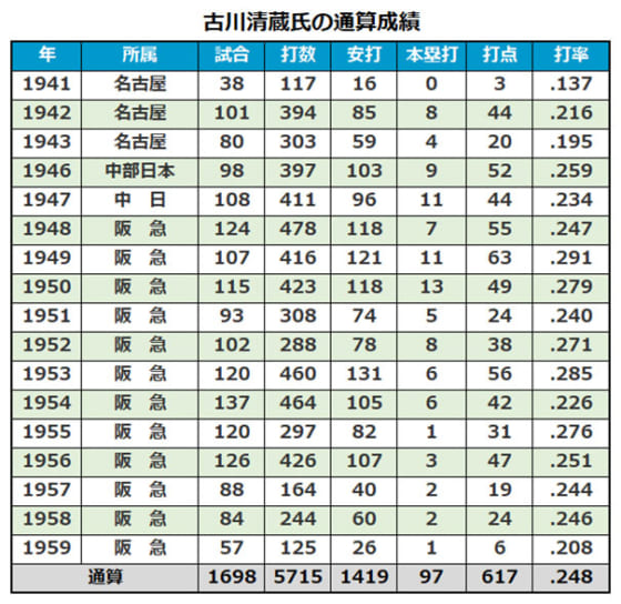10月17日、戦前は名古屋軍(現中日)、戦後は阪急の外野手として活躍し、2度の本塁打王にも輝いた古川清蔵氏が死去した。96歳だった。