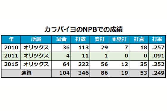 ベネズエラ出身のカラバイヨはアストロズ傘下マイナー、米独立リーグを経て、2009年に四国・九州アイランドリーグの高知ファイティングドッグスに入団。さらに、2010年にはBCリーグの群馬に移籍し、同年7月にはオリックスと契約した。