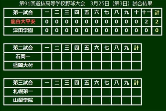 第91回選抜高校野球大会は25日、大会3日目が行われ、第1試合は全国最多41度目の出場となった龍谷大平安が2-0で津田学園に勝利。壮絶な投手戦となったが、延長11回に均衡を破り、大熱戦を制した。