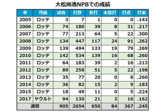 大松は2004年のドラフト5位でロッテに入団。2008年には134試合出場で打率.262、24本塁打、91打点を挙げるなど活躍した。2016年5月にアキレス腱を断裂する大怪我を負い、同年末に自由契約に。翌年、ヤクルトに入団。昨季限りで戦力外となった。