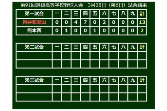 第91回選抜高校野球は28日、兵庫・西宮市の阪神甲子園球場で大会6日目が行われ第1試合は智弁和歌山(和歌山)が21世紀枠の熊本西(熊本)に13-2で勝利した。