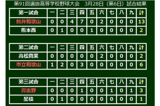 第91回選抜高校野球は28日、兵庫・西宮市の阪神甲子園球場で大会6日目が行われ、智弁和歌山(和歌山)、市和歌山(和歌山)、習志野(千葉)が勝利した。プロ注目の星稜・奥川恭伸投手は9回7安打10奪三振3失点の力投も2回戦で姿を消した。