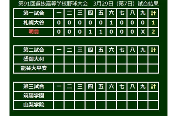 第91回選抜高校野球は29日、兵庫・西宮市の阪神甲子園球場で大会7日目が行われ、明豊(大分)が札幌大谷(北海道)に2ー1で競り勝った。