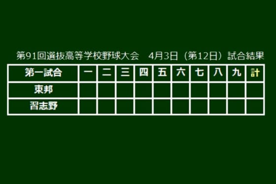 第91回選抜高校野球大会は3日(大会11日目)、紫紺の優勝旗をかけた決勝戦が行われる。決勝は30年ぶりの決勝で単独最多5回目の優勝を狙う東邦(愛知)と、初の決勝進出となった習志野(千葉)が激突する。