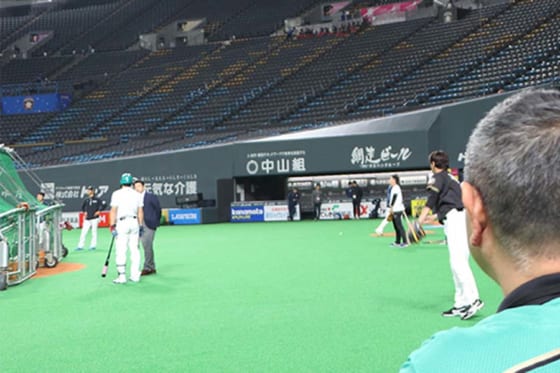 11時、試合の3時間前からイベントは始まる。まずは、パーソルDAY参加の20人によるダグアウトツアーが開催された。ファイターズの選手がフリーバッティングや、トスバッティング、守備練習を行う様子を、グラウンドの見学エリアで見学した。普段はネット越しでしか選手の練習姿を見られないが、今日は近くから思う存分写真を撮ったり、選手が試合に向けて集中力を高めていく様子を感じることができた。