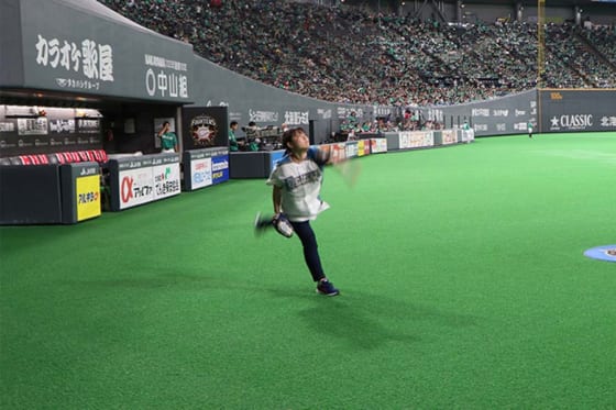 13時13分、試合直前。「パーソルDAY始球式投球権プレゼントキャンペーン」に当選した、札幌市の会社員・滝川智美さんが始球式の準備を行う。特に、中島卓也内野手の華麗な守備のファンだという滝川さんに、中島のサイン入りユニフォームをサプライズプレゼントしたところ、大感激! 学生時代はソフトボールの外野手として活躍したという経験もあって、事前の投球練習は完璧。キャッチボールの相手をした球団スタッフのグラブ目掛けてストライク投球を繰り返した。球を受けた球団スタッフに「いいですね、とてもうまいですよ。本番も期待できそうです。頑張ってください!」と声をかけられ、嬉しそうに笑う滝川さん。「昔、野球選手になりたかったんです。だから、今日はマウンドに立てるということでひとつ夢が叶いました!」