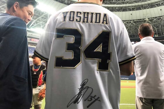 そんな谷口さんに、吉田正尚外野手のサイン入りユニホームをプレゼント。「打席に立つときに、自分の世界を持っている吉田正尚選手のファンなんです」と谷口さんは感慨深そうに眺め、袖を通した。