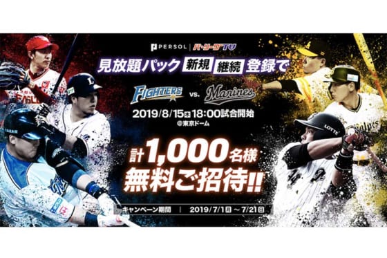 パ・リーグ公式動画配信サービス「パーソル パ・リーグTV」は7月1日から、8月15日(木)に東京ドームで行われる北海道日本ハムvs千葉ロッテ戦のチケットが、計1000名に当たるチケットプレゼントキャンペーンを開催する。キャンペーンには、特設ページのフォームから応募できる。