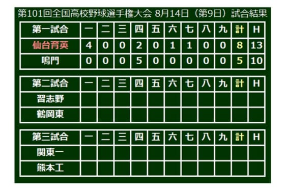 第101回全国高校野球選手権大会第9日が14日、甲子園球場で行われ、第1試合は仙台育英(宮城)が鳴門(徳島)を8-5で破って3回戦進出を決めた。