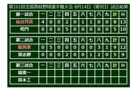 第101回全国高校野球選手権大会第9日が14日、甲子園球場で行われ、第2試合は鶴岡東(山形)が習志野(千葉)を9-5で破って3回戦進出を決めた。選抜準優勝の習志野は2回戦で姿を消した。