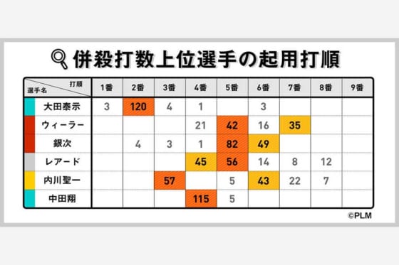 【併殺打数上位選手の起用打順】