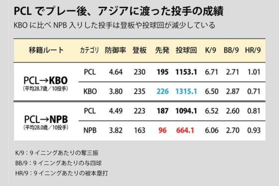 (※2)PCL、IL(インターナショナル・リーグ)でそれぞれ80イニング以上を投げ日韓球界入りしたアンソニー・ラナウドとケーシー・ローレンスは今回対象外としている。