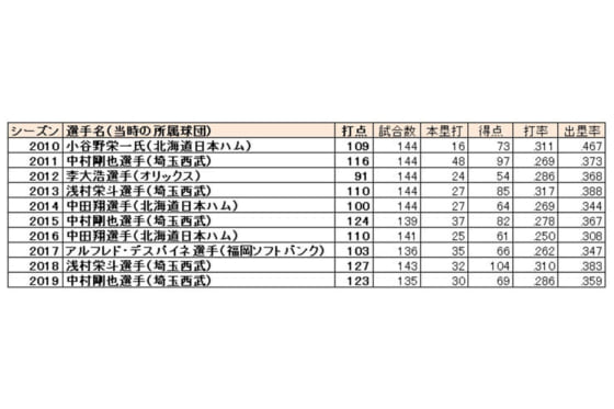 そこで、今回は直近10年間のパ・リーグにおいて打点王を獲得した選手たちと、その所属球団が記録したチーム全体の打撃成績を見ていきたい。さらに、歴代のシーズン打点記録でトップ10に入った選手たちと、当時の所属球団の打撃成績についても同様に確認し、はたしてどれだけの相関性が見られるのかをチェックしていこう。