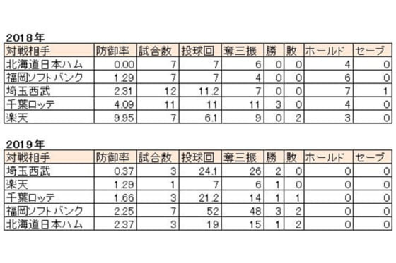 リリーフだった2018年は防御率9.95と楽天を極端に苦手とし、ロッテに対しても防御率4.09とやや苦戦していた。だが、2019年は両チームとの防御率は1点台と大きく改善している。また、2019年にはリーグ最高の得点力を誇る西武を防御率0.37と完璧に抑え込んでいる。5球団で最も防御率が悪かった日本ハムでも2.37という高水準で、どの球団に対しても安定した成績を残しているのも特徴的だ。
