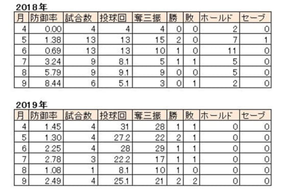 対戦相手別の成績と同様に、月別でも安定した成績を残している。2018年にはセットアッパーとして5月からフル回転を続けた影響もあってか、8月以降に防御率が大きく悪化した。だが、2019年には離脱期間こそあったが、すべての月で防御率2点台以下という安定感を発揮。前年に苦しんだ8月以降も好成績で乗り切った。
