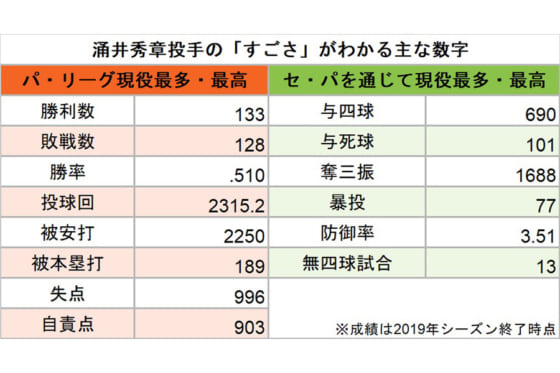 この表を見てもわかる通り、涌井はベスト、ワーストを問わず、数多くの部門において、並みいる投手たちの中でもリーグで最も多い数字を残してきた。これらの通算記録は、涌井が長年にわたって第一線で投球を続けてきたことの証明にもなるだろう。