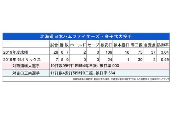 2019年に日本ハムの一員となった金子弌大投手は古巣のオリックス打線を完全に封じ込めた。昨季挙げた8勝のうち5勝がオリックスから。京セラドーム、ほっともっと神戸で2試合ずつ投げて計4勝、どちらの球場でも防御率0.00という数字を残し、その相性の良さを見せつけた。また、オリックスから勝ち星を挙げたことで史上18人目の全球団勝利を達成している。