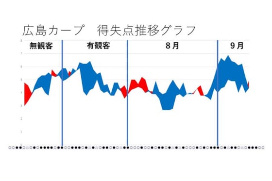 昨季0.5ゲーム差でクライマックスシリーズ進出を逃し、今季は佐々岡真司新監督を迎えて捲土重来を期した広島。その広島の2020年のペナントレース前半戦においてチームがどの時期にどのような波に乗れたかを、得点と失点の移動平均を使って検証してみる。(数字、成績は9月17日現在)