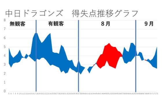 7年連続Bクラスと辛酸を舐めてきた中日。与田剛監督2年目のシーズンを迎えた。昨季規定打席に到達した5選手を中心とした打撃陣と、被打率.238、WHIP1.25がリーグ1位という投手陣の戦力の底上げを図り、挑んだシーズン。ペナントレース前半戦の得点と失点の「移動平均」から、チームがどの時期にどのような波だったかを検証する。(数字、成績は16日現在のもの)