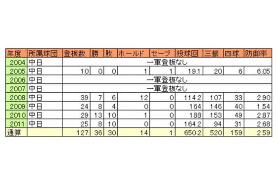 しかし、怪我の癒えた2008年に支配下復帰を果たすと、その後は1軍の舞台で持てる才能を発揮していく。このシーズンは先発と中継ぎを兼任しながら安定感のある投球を見せ、貴重な左腕としてフル稼働。故障を乗り越え、23歳の若さで1軍定着を果たすと、先発に固定された翌2009年にはまさに安定感抜群の投球を披露。リーグ2位の防御率2.00を記録した同僚の吉見一起投手に大差をつけ、自身初タイトルとなる最優秀防御率に輝いた。