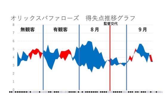 5年連続でBクラスの低迷を打破すべく、山岡泰輔と山本由伸の2枚看板を擁する投手陣と、現役メジャーリーガーのアダム・ジョーンズが加入した攻撃陣でペナントレースに挑んだオリックス。今年のペナントレース前半戦の得点と失点の「移動平均」から、チームがどの時期にどのような波だったかを検証する。(数字、成績は9月27日現在)