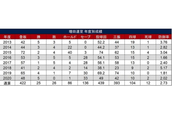 2019年には自身初の30セーブに到達し、リーグ優勝の胴上げ投手にもなった。続く2020年は年間120試合に短縮されたにもかかわらず、セーブ数を前年以上に伸ばしてみせた。その結果、シーズン無敗で最多セーブに輝く快挙を達成しただけでなく、豊田清コーチが記録した通算135セーブという数字を抜き、球団史上最多記録を更新。今や百戦錬磨となった増田投手にとっても、さまざまな意味で大いに意義のあるシーズンだったことだろう。