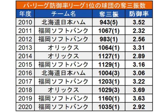 下記は、2010年以降のパ・リーグで、防御率1位のチームを一覧にしたものだ。奪三振数も記載した。()内が同年の奪三振数のリーグ順位。