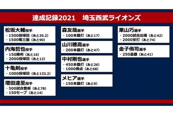 投手陣では、昨季最多セーブ投手賞の守護神・増田達至投手が150セーブまであと「14」。松坂大輔投手は通算1464回1/3、内海哲也投手は通算1988投球回で、節目の投球回まであと少しとなっている。近年は1軍登板も少なくなっているが、万全なコンディションで長く投げ続けてほしいところだ。