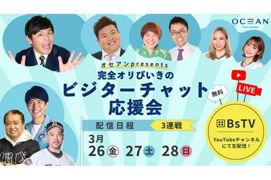 オセアン株式会社がスポンサーとなり、26日~28日の西武戦の3連戦全日程で、オリックス公式YouTubeチャンネル「BsTV」にて生配信される。お笑いコンビ・ますだおかだの岡田圭右さんなど、3日間それぞれでバラエティー豊かな特別ゲストを招く。オリックス愛あふれるトークを聴きながら、YouTubeライブのコメント機能を使って、遠くのオリックス戦士に熱いエールを送ろう!