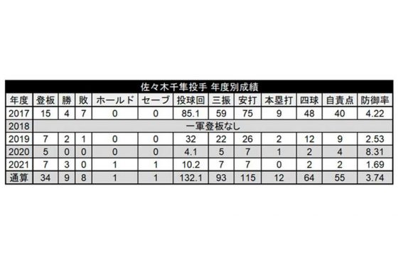 プロ入りからの4年間は故障もあって苦しいシーズンが続いていたが、今季は投球内容や指標の面でも進化が見られる。今回は、佐々木千のこれまでの経歴、そして、先発時代と現在のピッチングスタイルがどう変化しているのかという点を、各種の指標から紹介していきたい。(※成績は5月5日現在)