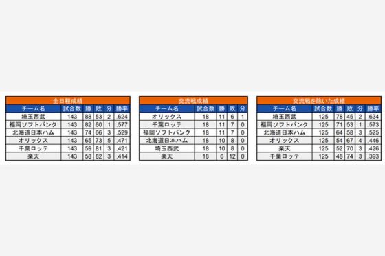開幕から首位を独走した西武をはじめ、1位から5位までのチームが交流戦で10勝以上を記録。それもあって、1位から4位までの順位や趨勢には大きな変化がなかった。そんな中で唯一、楽天は交流戦で負け越していたが、シーズン中盤からは徐々に調子を上げていった。それに加えて、5位のロッテが終盤戦で急失速していたこともあり、交流戦を除いた成績においては、5位と6位の順位が入れ替わることになった。