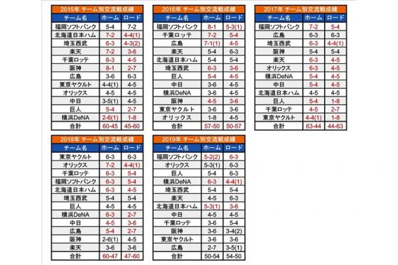 2015年から2019年の間に開催された5度の交流戦における各チームの成績を見ていこう。(赤字の部分は、ホームの勝率がビジターを上回ったチーム)