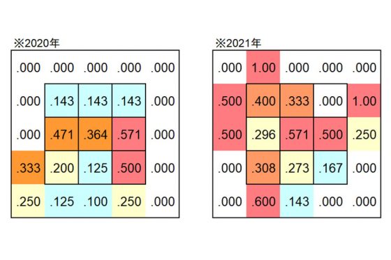 その一方で、2020年は高め以外の内角のストライクゾーンは2カ所とも打率.500以上と、インコースを得意とする傾向にあった。今季は前年に得意とした内角低めに対する打率は大きく下がっているが、外角のボールに対しては、ボールゾーンに落ちる球も含めて、いずれも一定以上の数字を記録している。